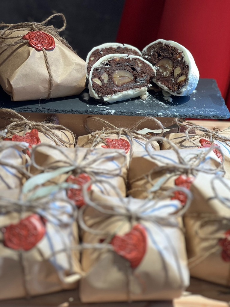 さて本日は新商品3品をご紹介します。シュトーレンショコラマロンはラッピングにもこだわっていますよ。中にはスパイスショコラシュトーレンにくるみとラムレーズン、そして栗!