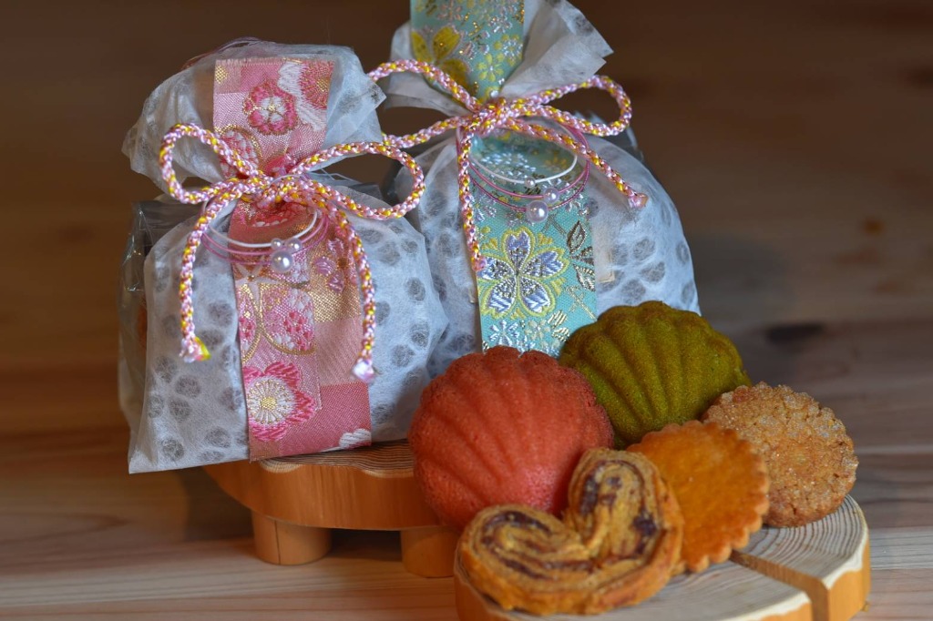 こちらはマドレーヌ2個とクッキーなど3枚を詰め合わせております。そしてパールの3連ネックレスのような飾りと着物風のリボンを帯のようにつけて華やかな雰囲気に仕上げております。ギフトって見た目もとても大切ですよね?素敵なラッピングはそれだけで嬉しい気持ちになりテンションもちょっと上がってしまいますよね!