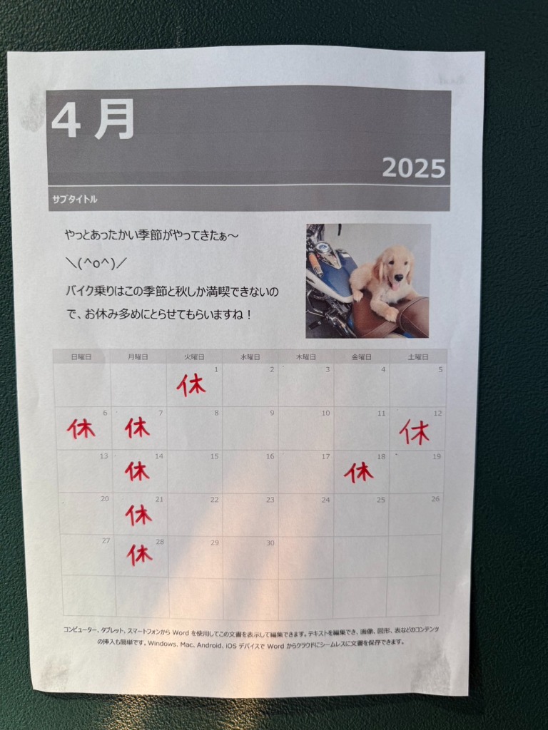 4月は通常通りの毎週月曜日のほか、お休みをいただく日がございますのでお気をつけてお越しくださいね。皆様のご来店をお待ちしております。