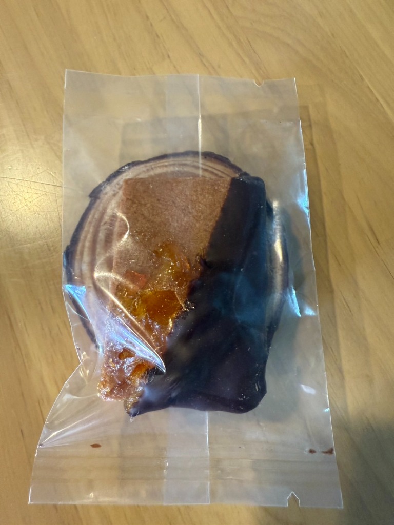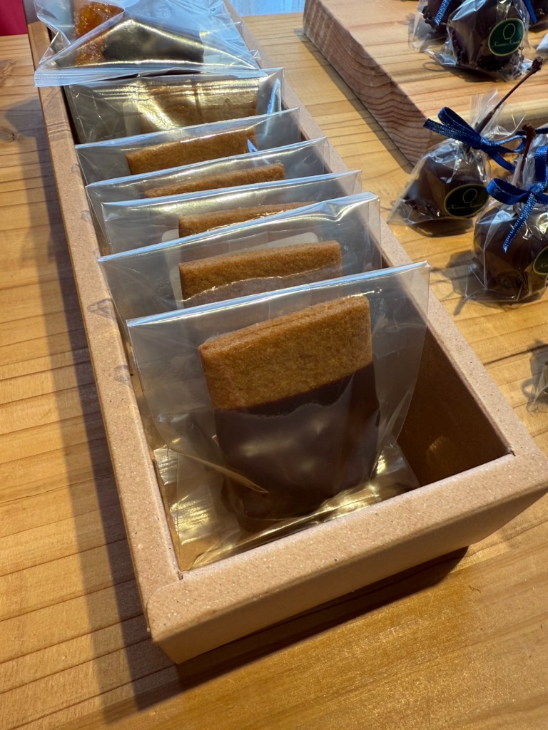 こちらはアーモンドパウダーたっぷりのサクサク生地のクッキーの上に、オレンジのコンフィチュールを塗って、さらにチョコでコーティングしています。1枚でも食べ応えばっちり、大満足♪もちろん、オレンジコンフィチュールもシェフの手作りですので、実はとても手の込んだひと品なんです。