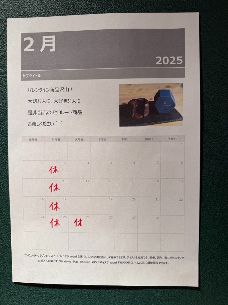 2月の休業日をお知らせ致します。(遅くなってすみません!)