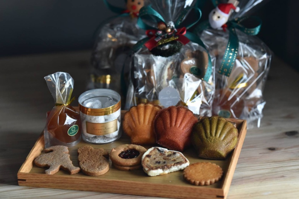 プレーンマドレーヌ、苺マドレーヌ、抹茶マドレーヌ、素朴なクッキー、リュネット、シュトーレンカット、スペキュロス2枚、りんごのゼリーにブールドネージュ。